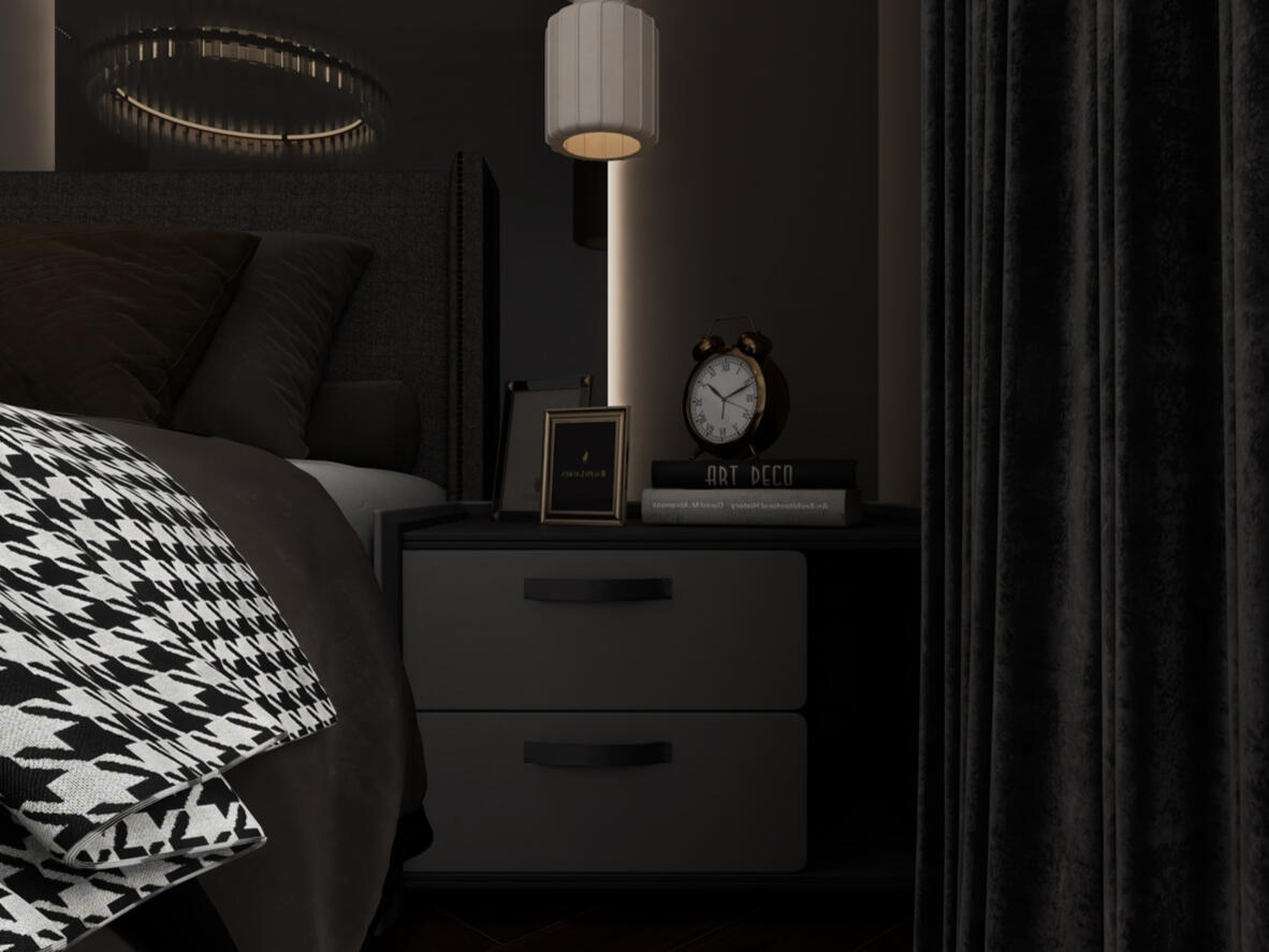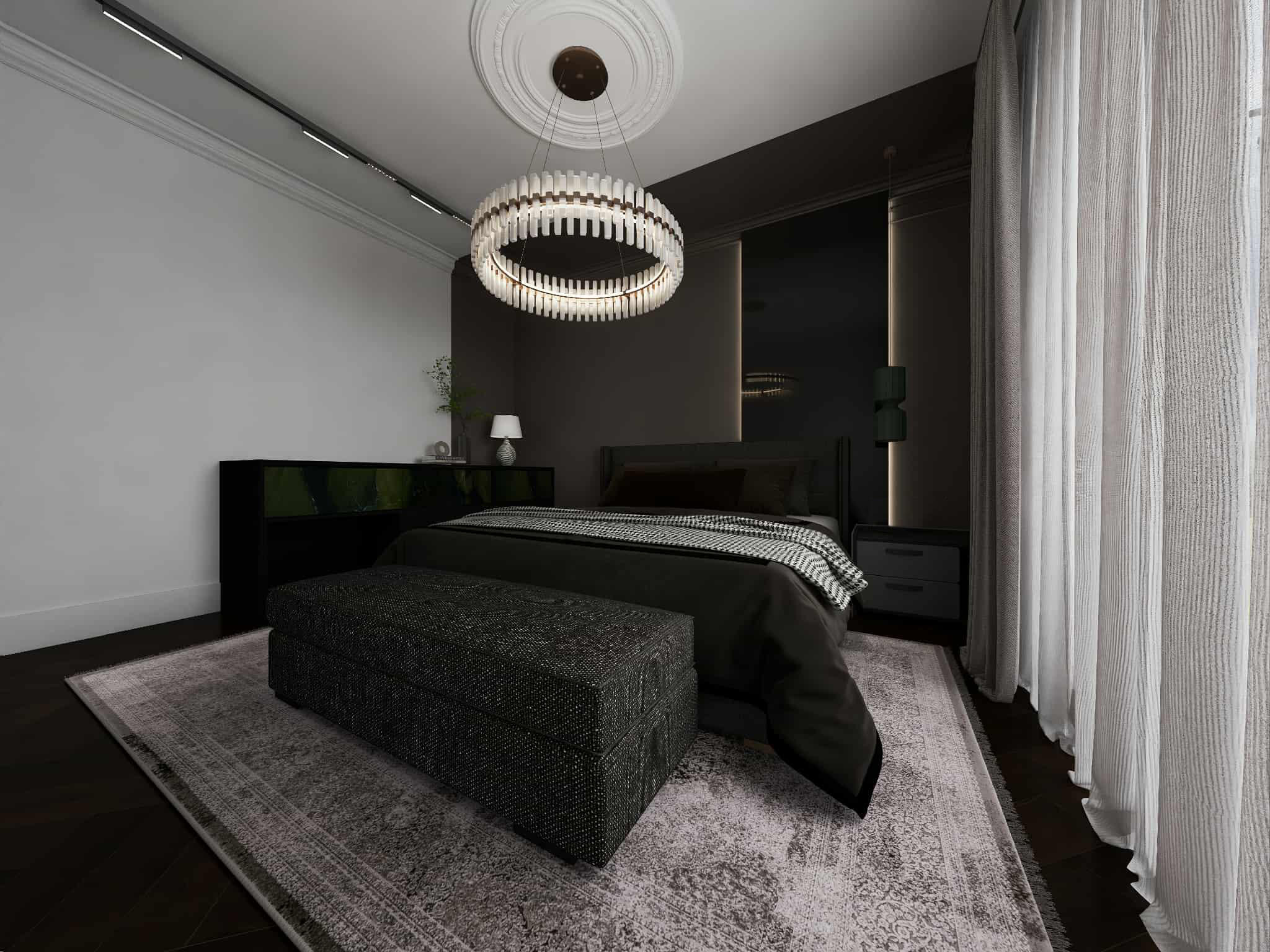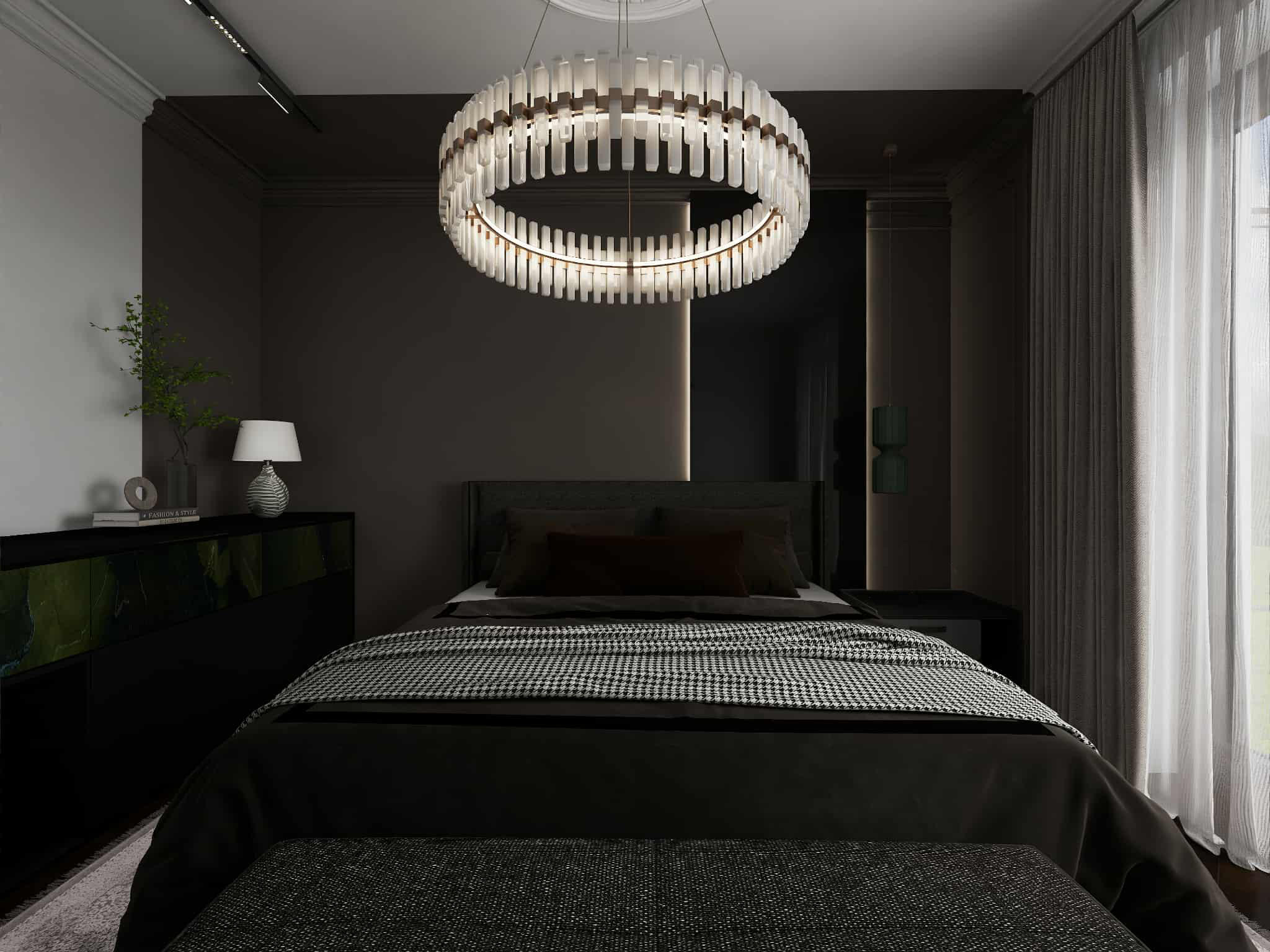 A combination of ambient, task, and accent lighting creates a warm glow and balances the darker elements. Modern chandeliers and pendant lights with black or metallic finishes add contemporary elegance.