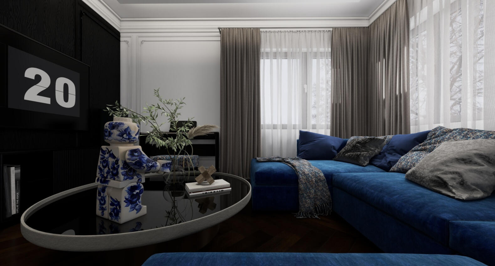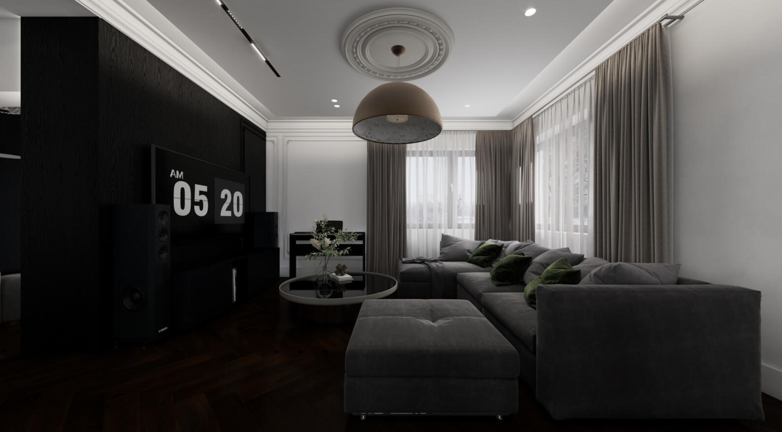 Monochromatic luxury and sculptural serenity, interpreting a modernized American classic style. This is a space where darkness acts as a backdrop to highlight textures, art, and precision lighting.