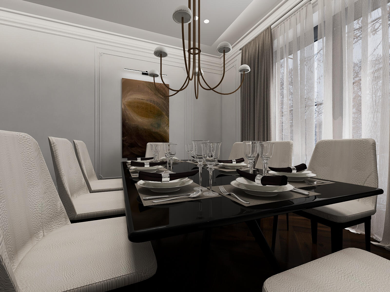 • Upholstered dining chairs and minimalist black table