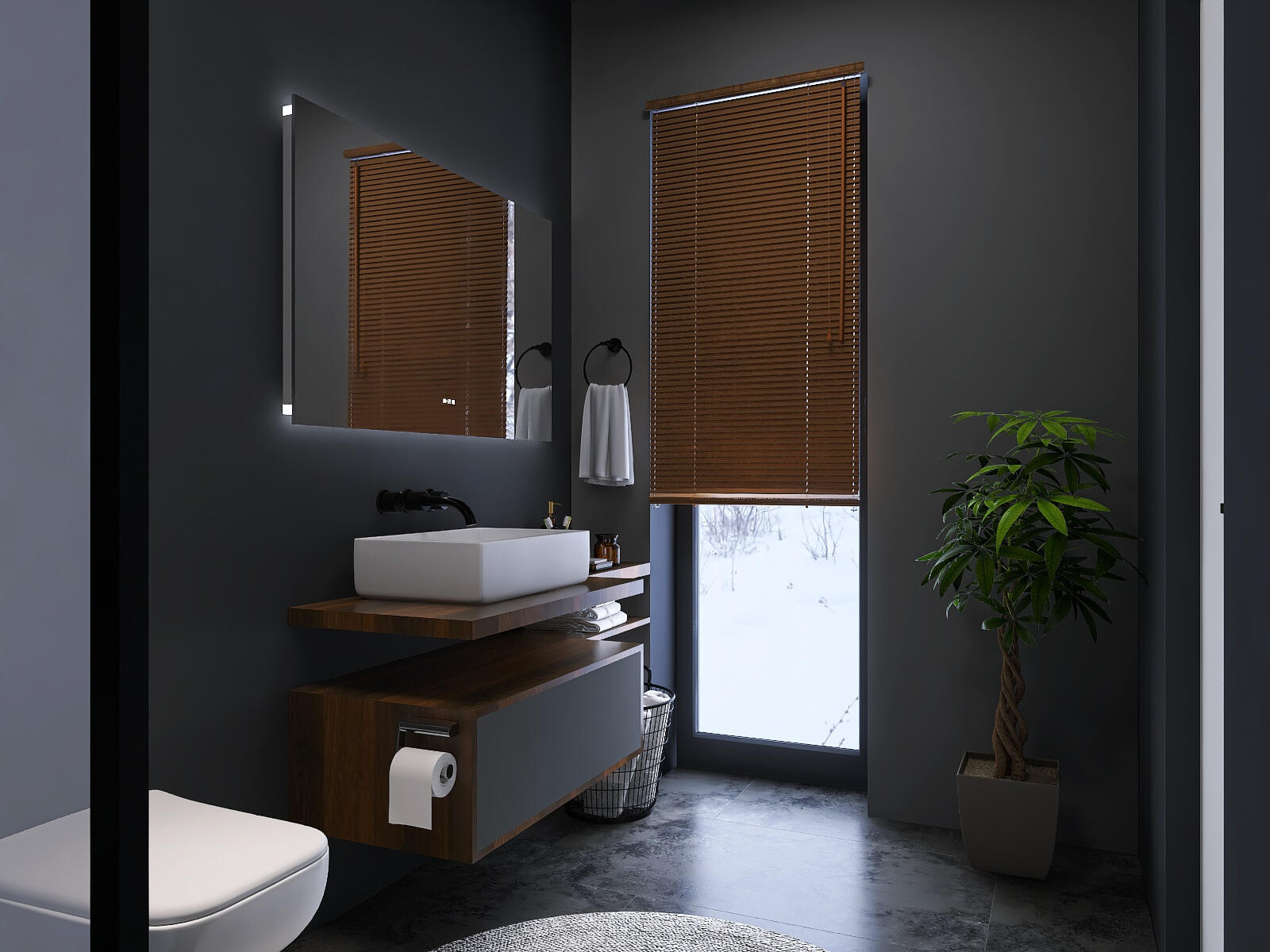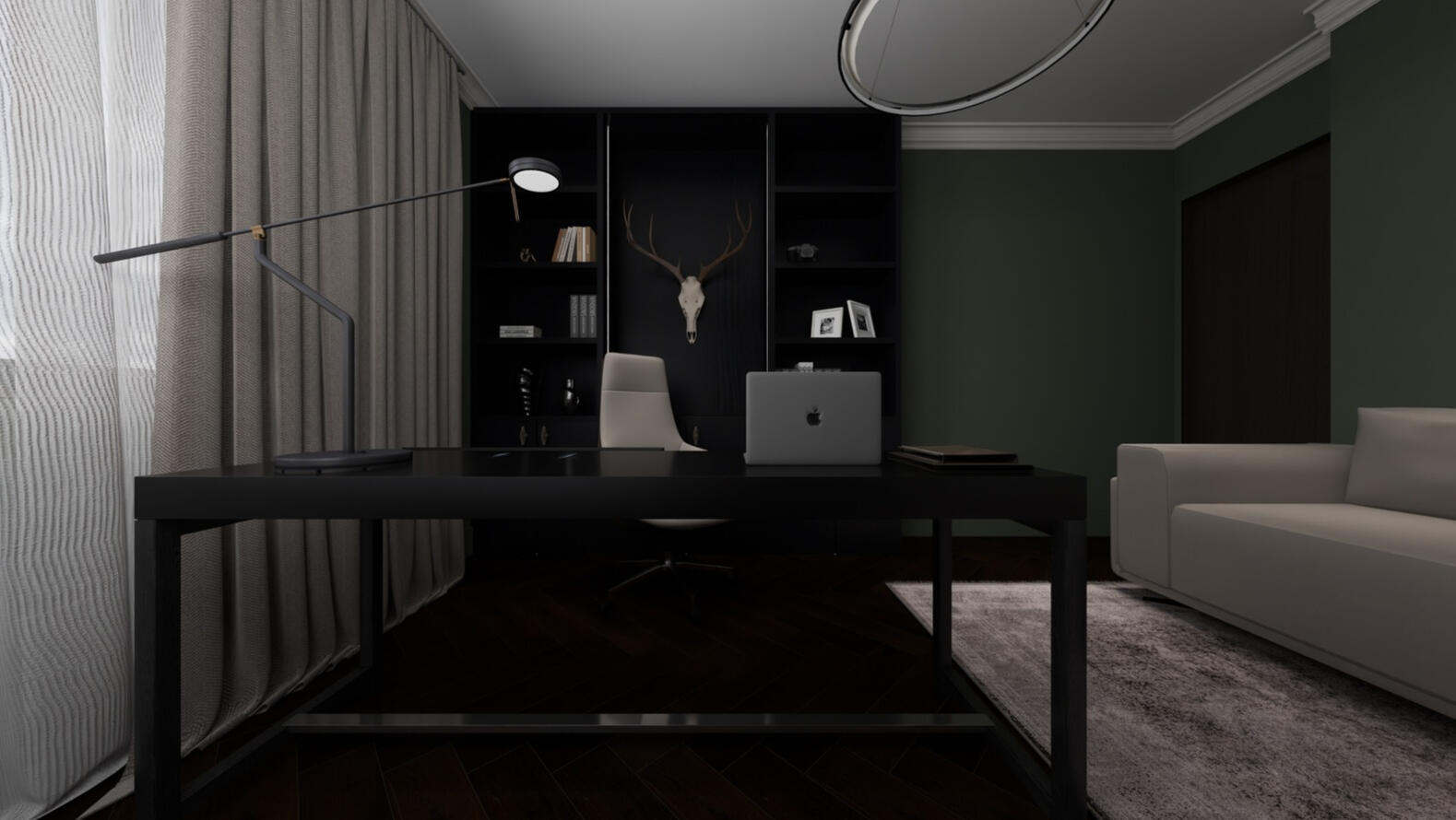 Deep, saturated hues (charcoal grays, rich blacks) that allow spaces to recede and foster inward focus, creating intimate enclosure rather than claustrophobia; the strategic use of light to enhance the sense of intimacy and calm.