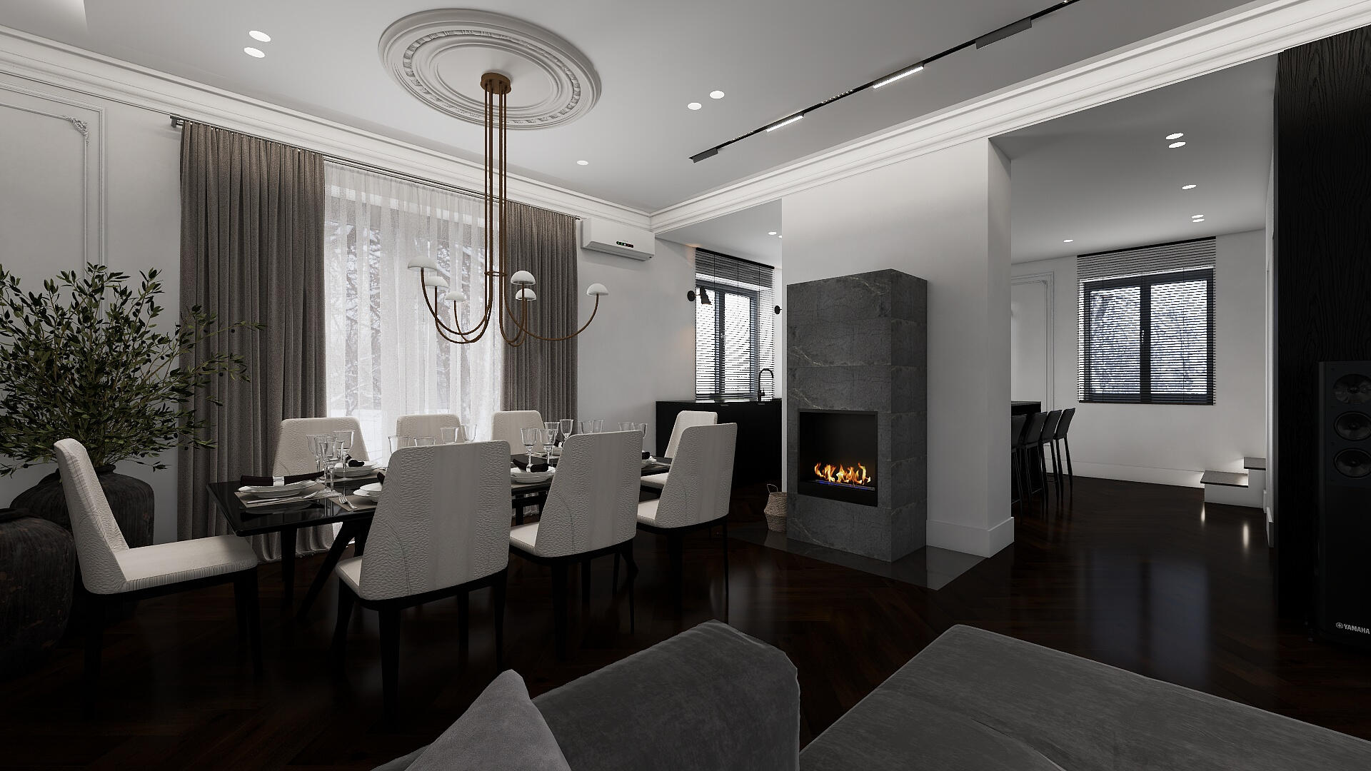 A modernized American aesthetic, manifested through substantial ceiling and wall moldings and traditional rosettes, boldly paired with ultra-modern linear lighting systems; a monumental stone fireplace serves as a central axis symbolizing hospitality.