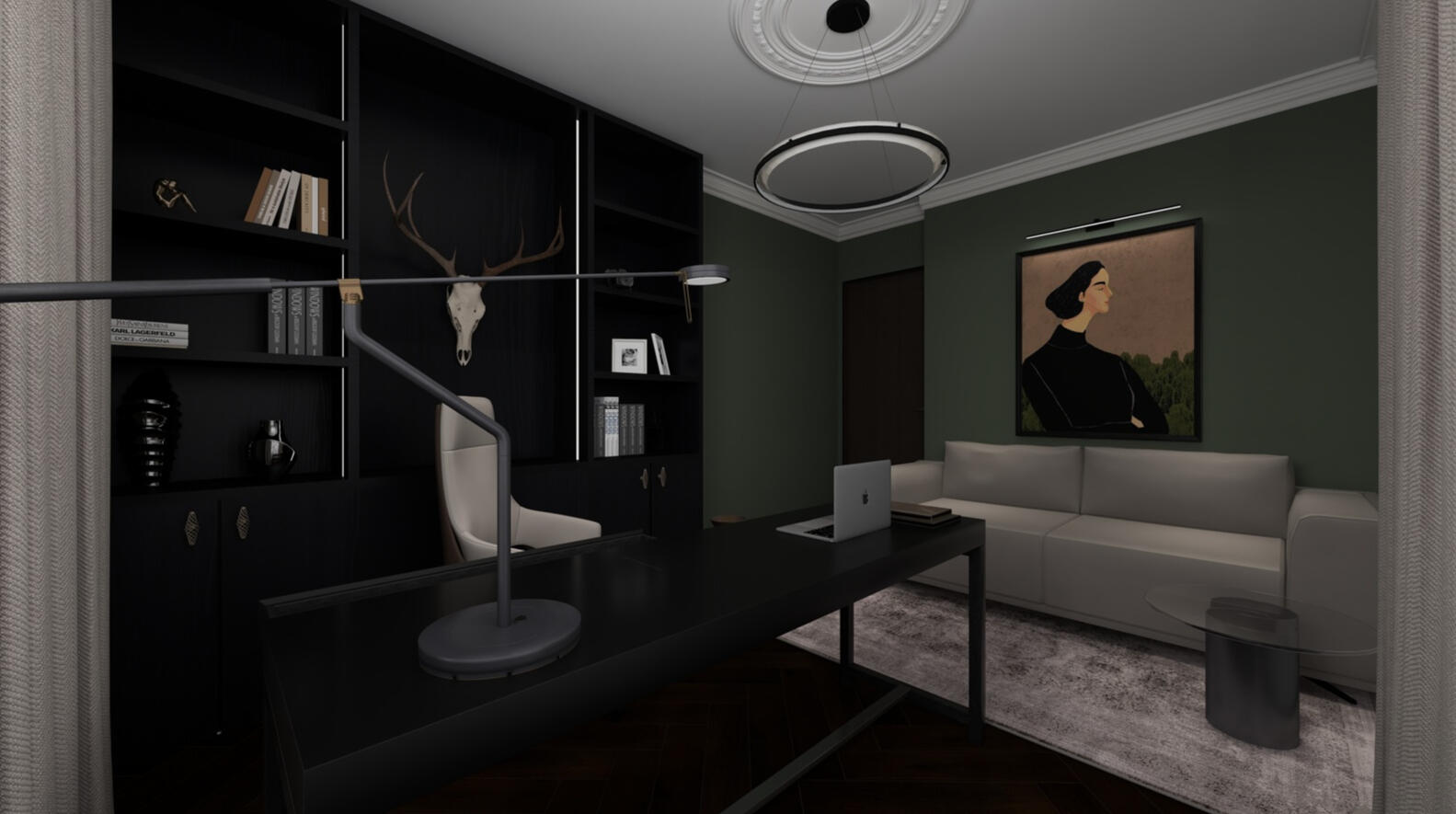 To achieve a sophisticated and functional entertainment space with a strong visual identity, ideal for relaxing, socializing, and showcasing design-conscious taste.