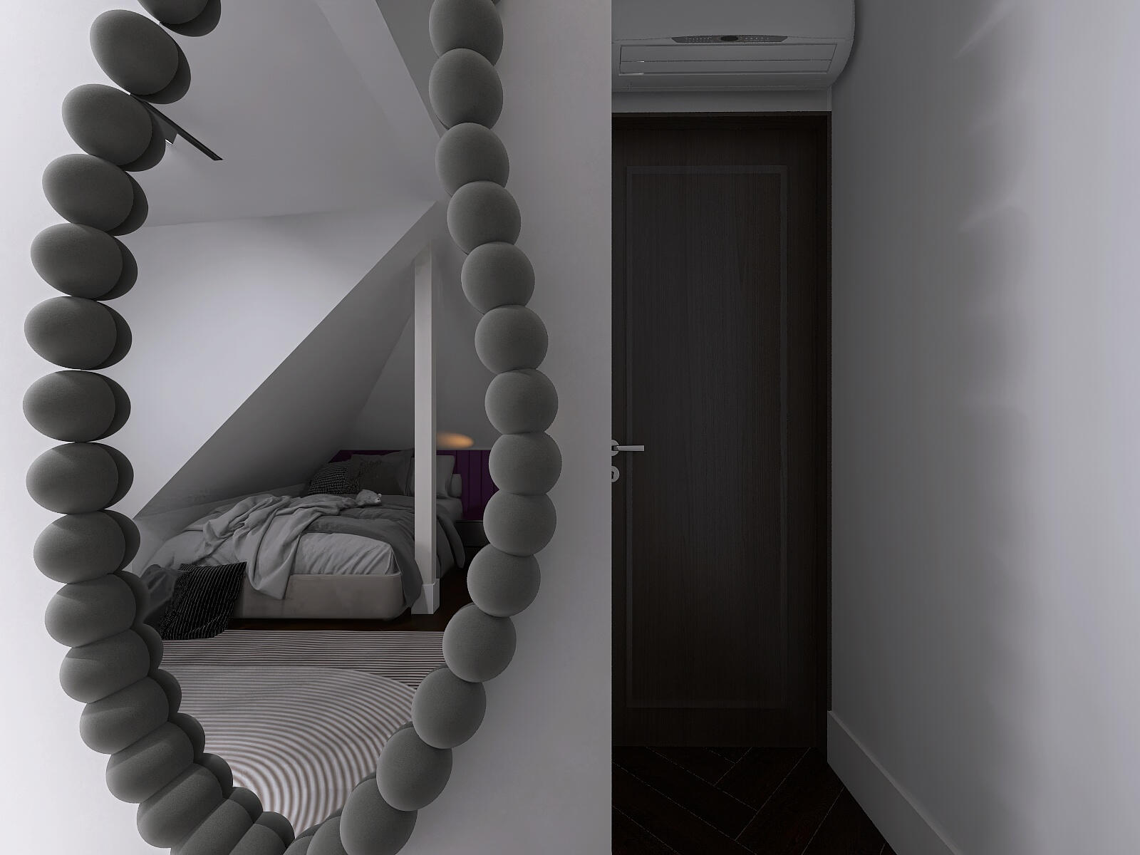 Smooth, light gray upper wall transitioning to full-height textured panels resembling concrete or stone, creating contrast and depth.