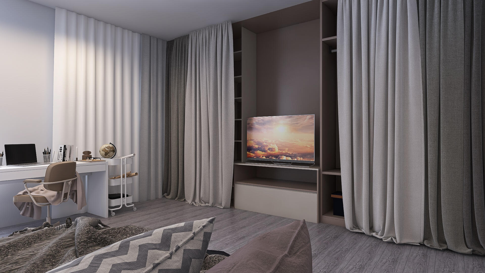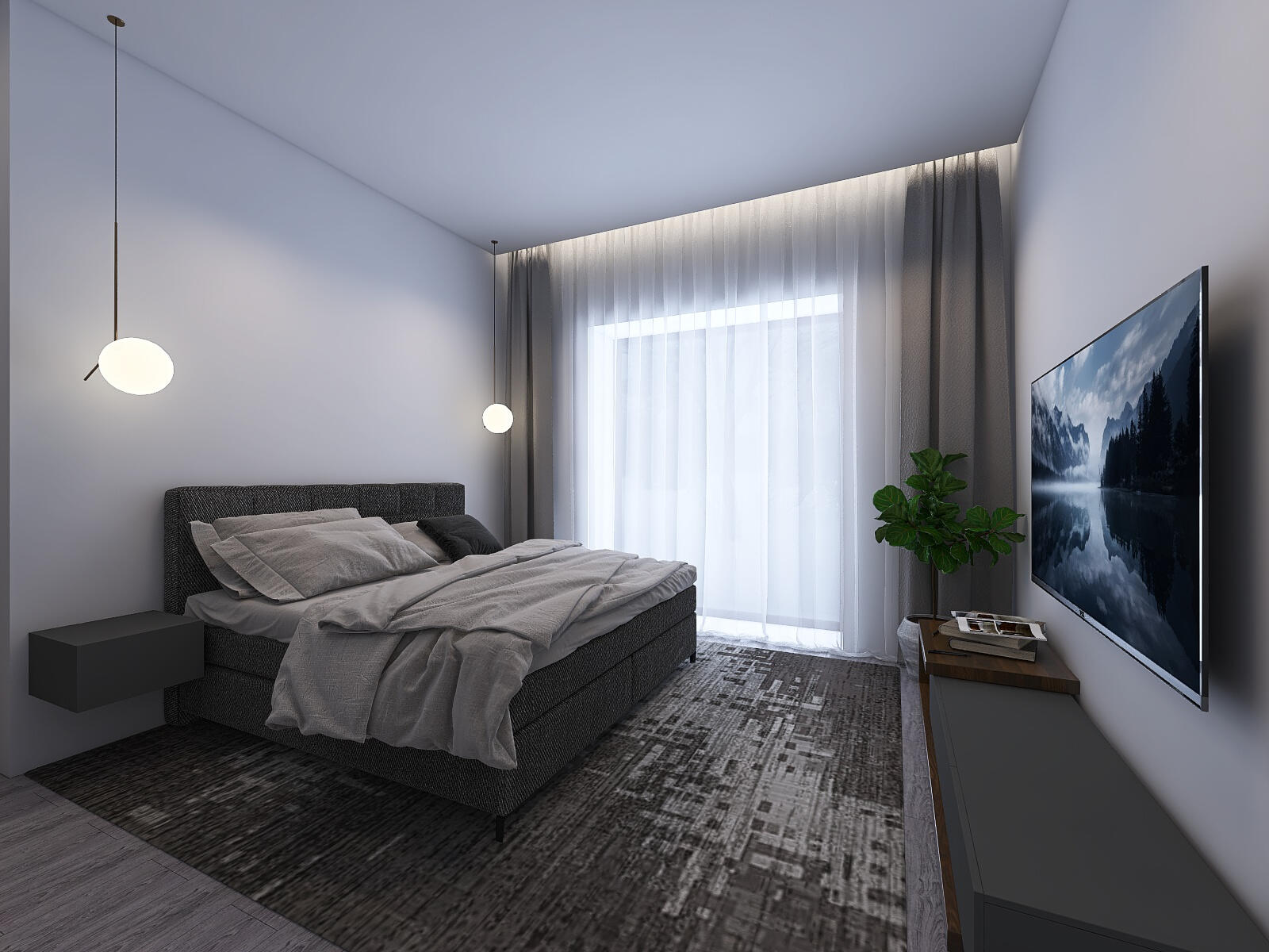 • Wall-mounted flat-screen TV as the visual anchor