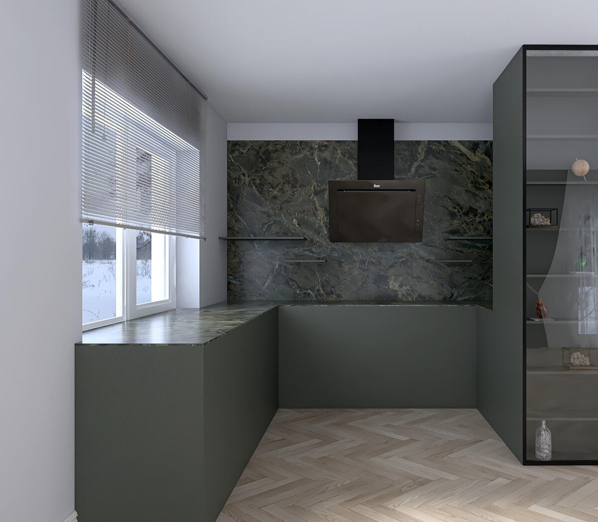 The furniture is minimal, with built-in cabinetry forming an L-shaped counter. There is also a tall, glass-fronted cabinet on the right side, offering both display and storage functionality while maintaining visual openness.